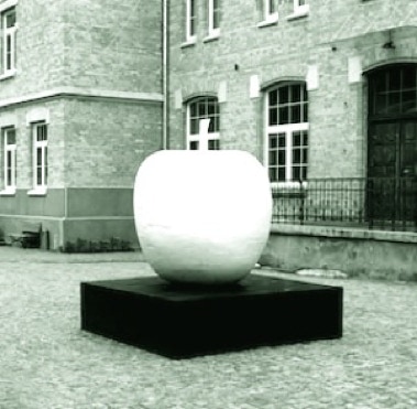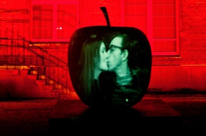 The screen for the projection has been monumental monochromatic apple sculpture that has been presented on the stage in a form of block cut from the cube where the foundation was a square and height of 1/4 of a square. We have an apple in a square. Fruit that is part of nature on a geometric shape is not occurring in the environment. The clash of two worlds: nature and culture that show their mutual struggles. “The Big Apple” is a symbol of Manhattan. Apple that presents itself majestic on a quarter that is a part of orderly system of this city and culture and its density. An apple: symbol of power and temptation.